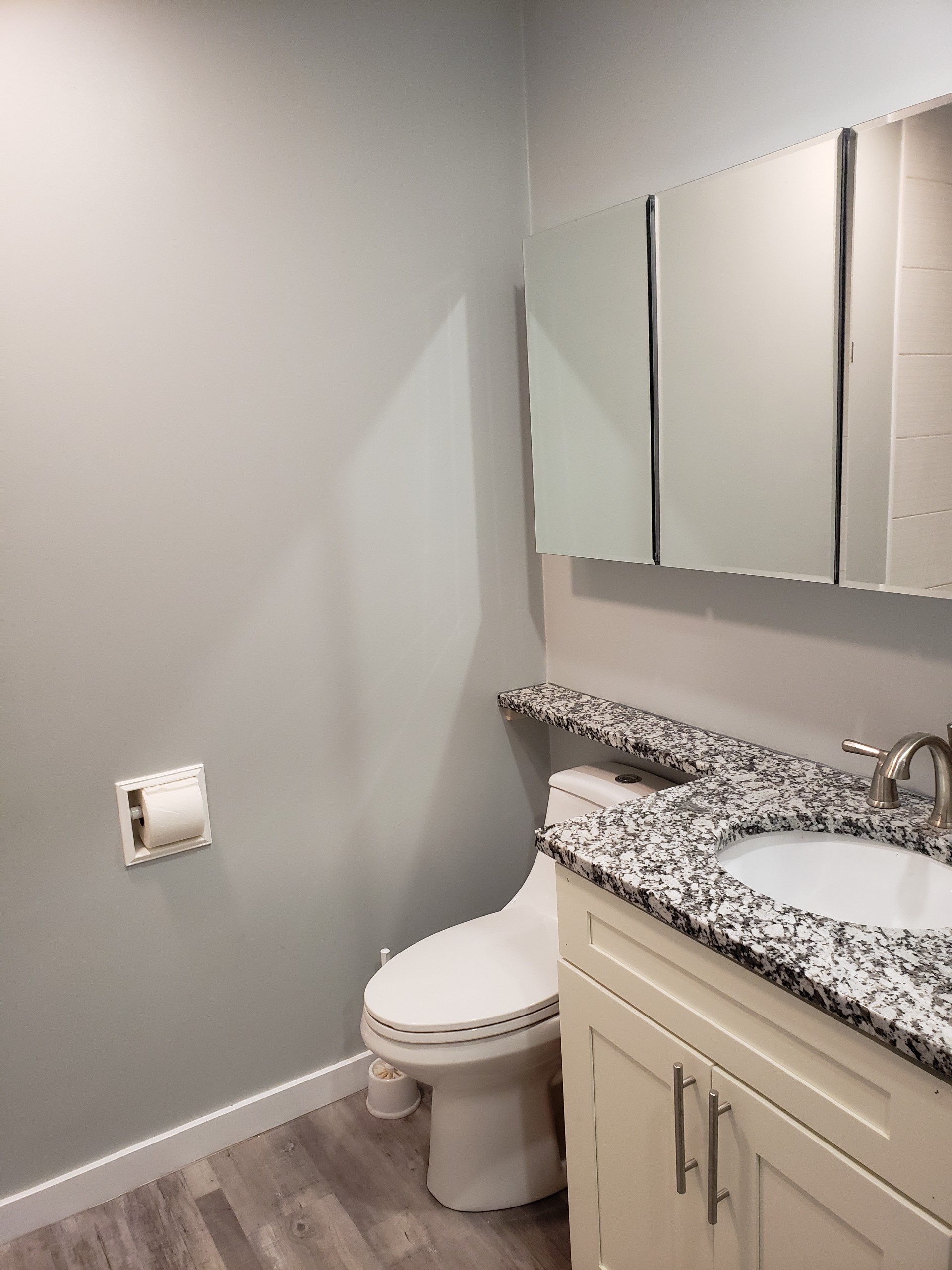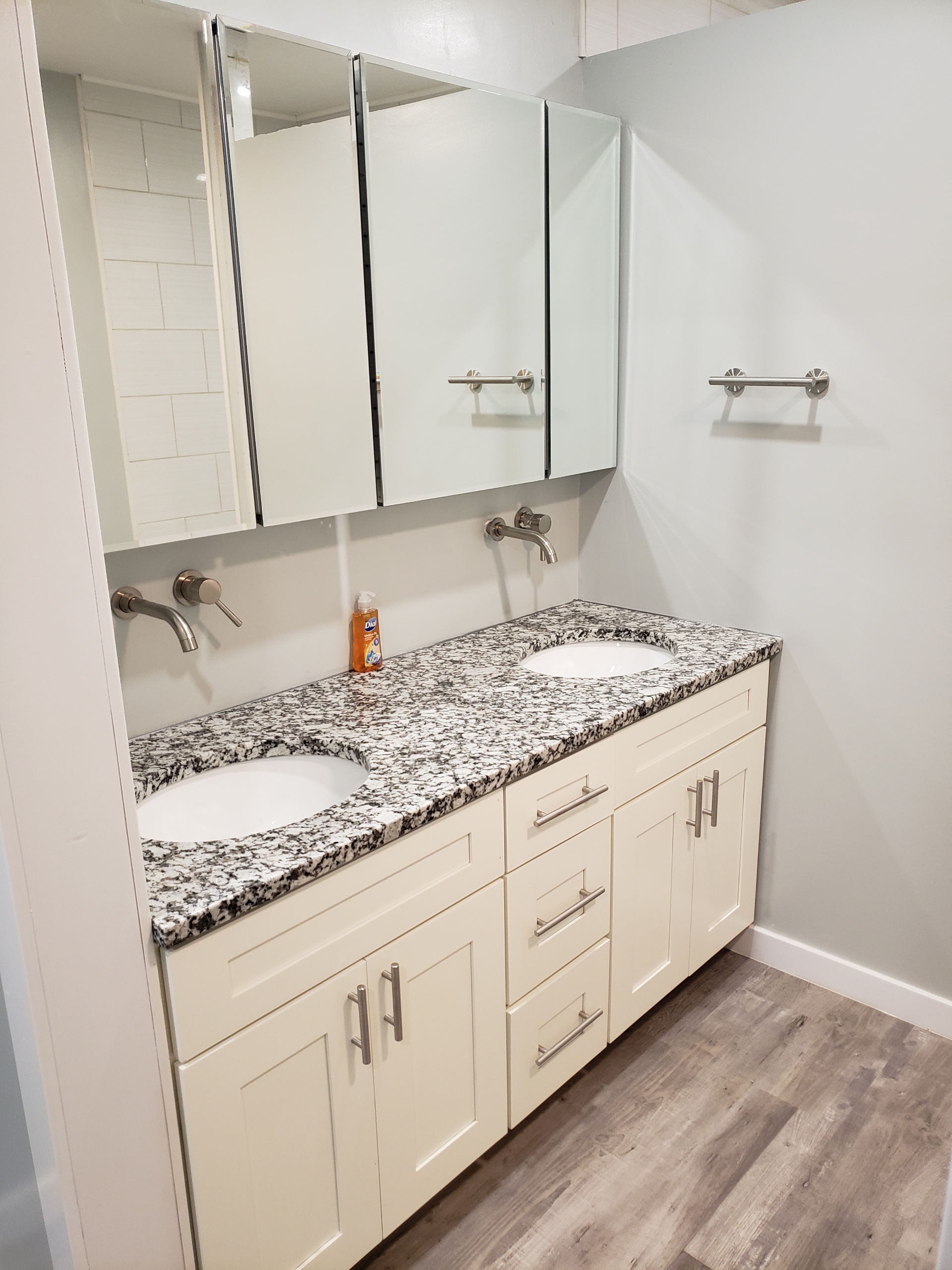 - Large continuous recessed mirrors with internal shelving & granite in both bathrooms