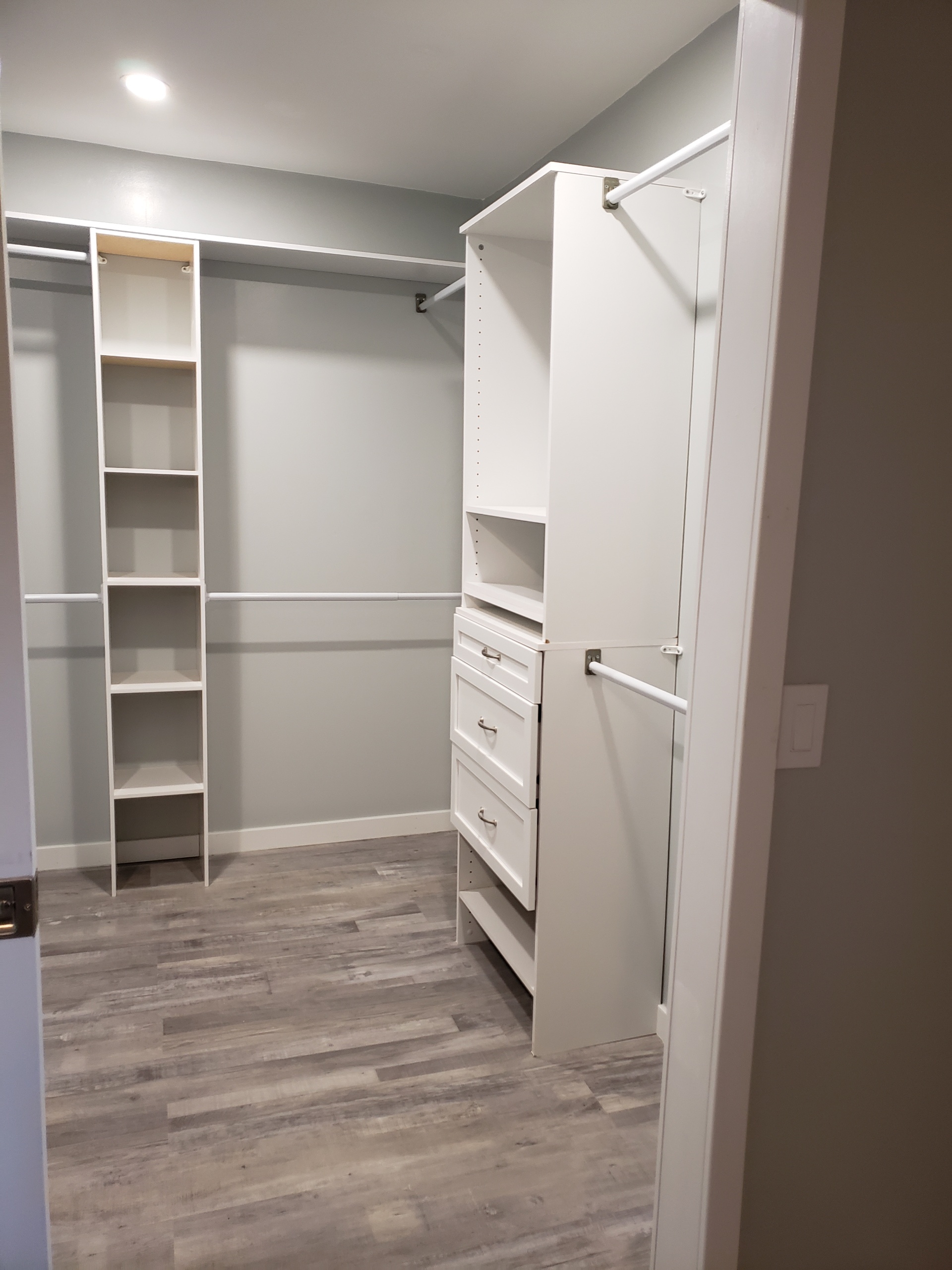 - His & hers 8×8 California closet with skylight, space for dresser, bench, or shoe rack with privacy from sleeping area for sleeping partners with different work schedules